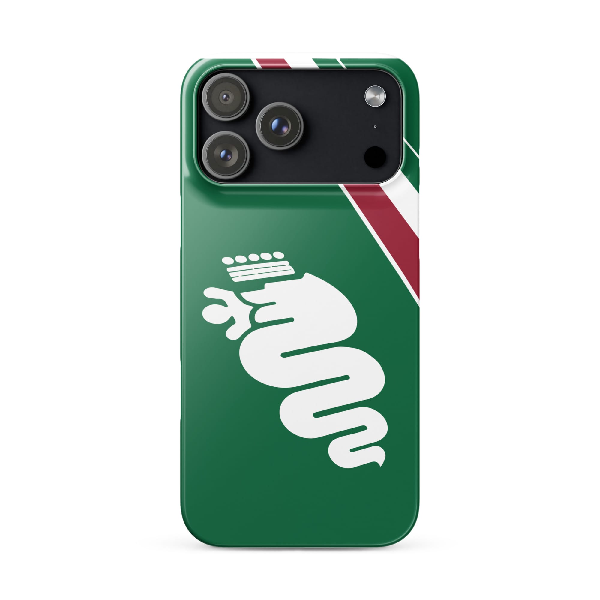 Introducing our Snap Case for iPhone, featuring a captivating graphic of the iconic Alfa Romeo logo with an Italian color scheme. This sleek and stylish case not only safeguards your device but also adds a touch of excitement to your everyday life.