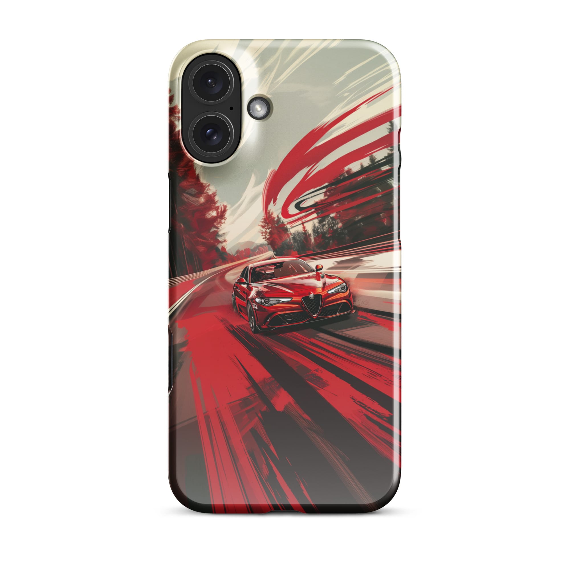 Introducing our Snap Case for iPhone, featuring a captivating graphic of the iconic Alfa Romeo Giulia Quadrifoglio driving at lightning speed on the legendary Nurburgring race track. This sleek and stylish case not only safeguards your device but also adds a touch of excitement to your everyday life.